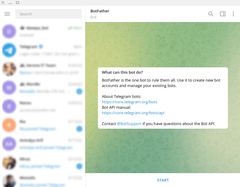 To build a Telegram bot with O2Z.AI, first, open your Telegram App. Then in the search bar of the app, search with the ‘BotFather’ keyword. Then select the verified BotFather account.