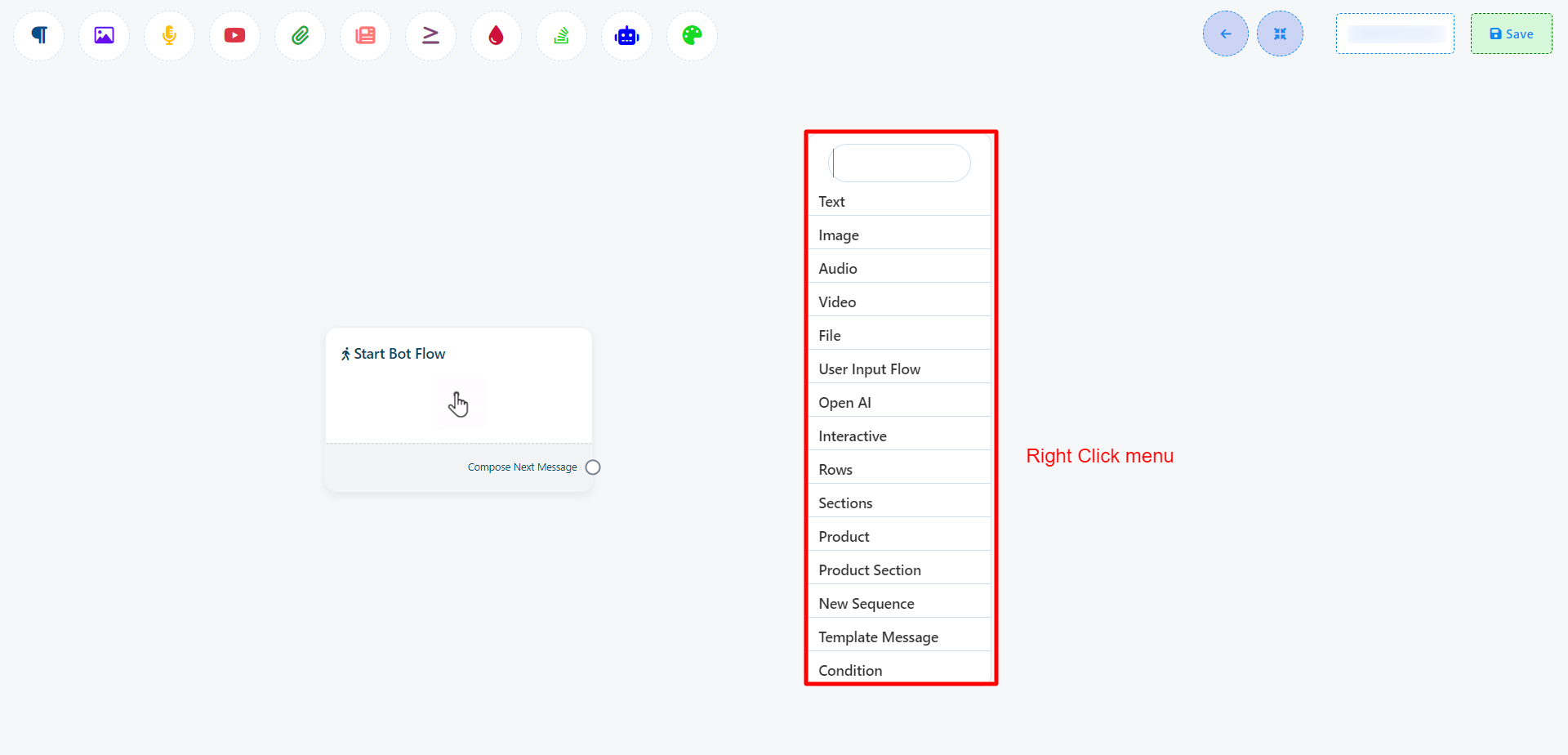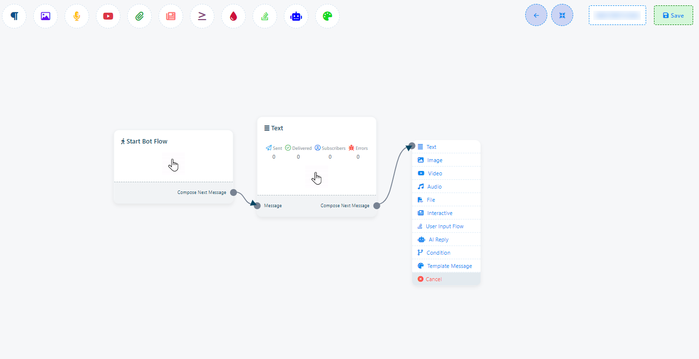 Once you`ve completed the `Start Bot Flow` setup, you`ll encounter a sockets: `Compose Next Message`, These sockets allow you to add various components and configure them.