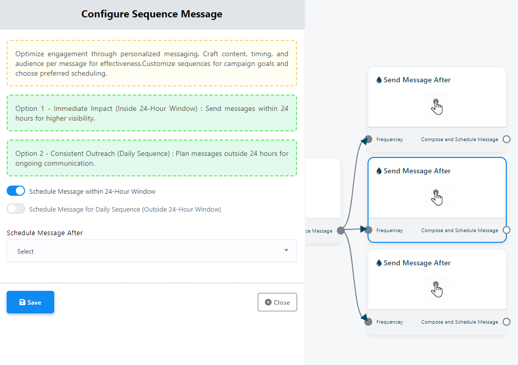 `Schedule Message Within 24-Hours Window`: This button initiates the sequence to begin within a 24-hour timeframe.