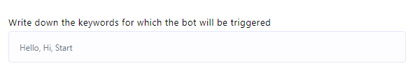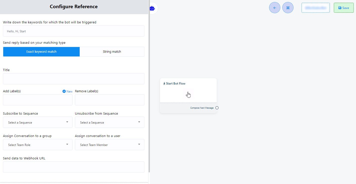 - Keyword Triggering: To initiate the bot using specific keywords,double-click on the `Start Bot Flow` element. This action will open the `Configure Reference` in the left side, featuring ten fields and two buttons. In the first field, you can input a list of comma-separated keywords. When a user enters text in the messaging window that matches any of these keywords, the bot will be triggered.
