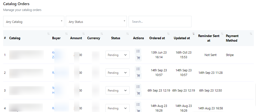 - You can view catalog orders and change the status of an order from the `Catalogue Order` at the top of the page.